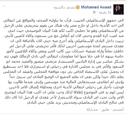 نشر حارس الاسماعيلى محمد عواد تصريح له على حسابه الشخصى فى موقع التواصل الاجتماعى الفيس بوك واكد فيه انه يرغب فى البقاء بالاسماعيلى ولكن المجلس يرغب فى التخلص منه !! واكد ان امر انتقاله من عدمه للزمالك فى يد مجلس الاداره