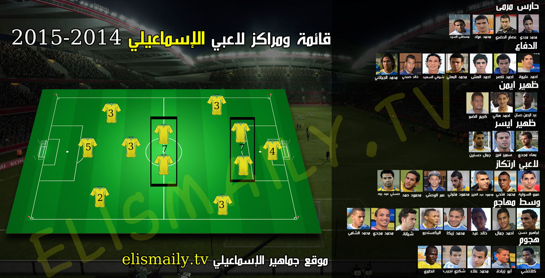 يدخل الاسماعيلى الموسم الجديد 2014 -2015 وهو يمتلك عدد ضخم من اللاعبين لاول مره يصل الى 36 لاعب تقريبا بواقع 3 – 4 لاعبين فى كل مركز والميزه الاساسيه فى العدد الكبير هو تقارب عقود جميع اللاعبين من بعضهم البعض باستثناء 4 او 5 لاعبين فقط لا غير .