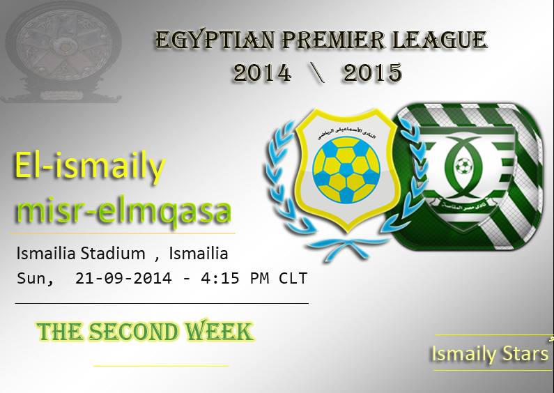 يلتقى الاسماعيلى نادى مصر المقاصه فى تمام الساعه الرابعه والربع من عصر اليوم الاحد فى اطار مباريات الاسبوع الثانى للدورى العام على استاد الاسماعيليه .