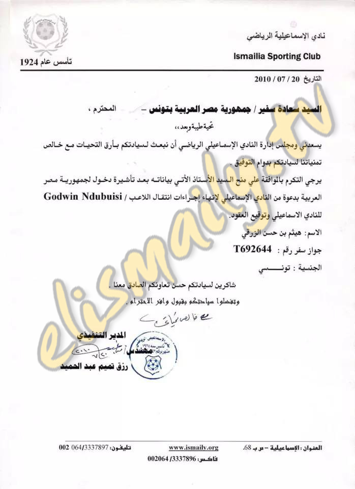 علم موقع Elismaily.tv ان هناك جلسه ستجمع العميد محمد ابو السعود رئيس الاسماعيلى غدا بوكيل اللاعب النيجيرى جودوين التونسى هيثم الزرقى فى امارة دبى بالامارات لبحث شكوى الزرقى بالفيفا ضد الاسماعيلى ويطالب الوكيل التونسى بمبلغ 90 الف دولار .