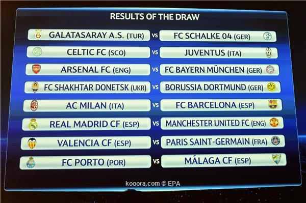 وفي سيناريو متكرر للعام الماضي، سيلتقي فريقا ميلان الإيطالي وبرشلونة الأسباني ولكن هذه المرة في دور ال16 بدلا من دور الثمانية الموسم الماضي، بينما تقام مباراة أخرى قوية بين ارسنال الانجليزي وبايرن ميونخ الألماني.