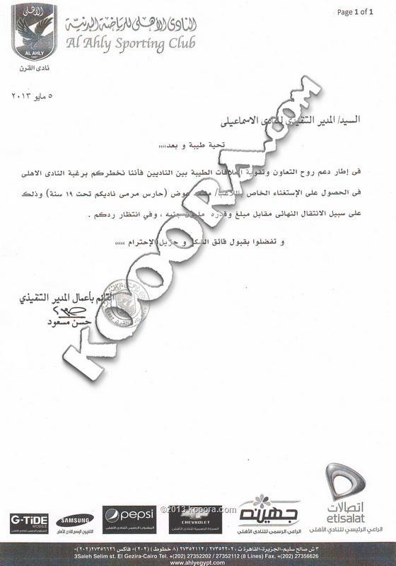 ارسل النادى الاهلى فاكس رسمى صباح اليوم بطلب ضم مسعد عوض حارس الاسماعيلى الشاب مقابل مليون جنيه فقط لا غير كما انفرد امس موقع elismaily.tv بعدما طلب رئيس الاسماعيلى محمد ابو السعود مبلغ مليون ونصف المليون جنيه ومن خلال مصادر الموقع مع الوكلاء وداخل الاهلى علمنا ان اداره التسويق بالاهلى وضعت مبلغ مليون جنيه فقط كحد اقصى لاتمام الصفقه وتقليل نسبه الاسماعيلى فى بيع الاهلى المستقبلى للحارس ولن تزيد عن 10 -12 % فى افضل تقدير مع العلم ان مسئولى الاهلى يساومون لدفع المبلغ بالتقسيط .